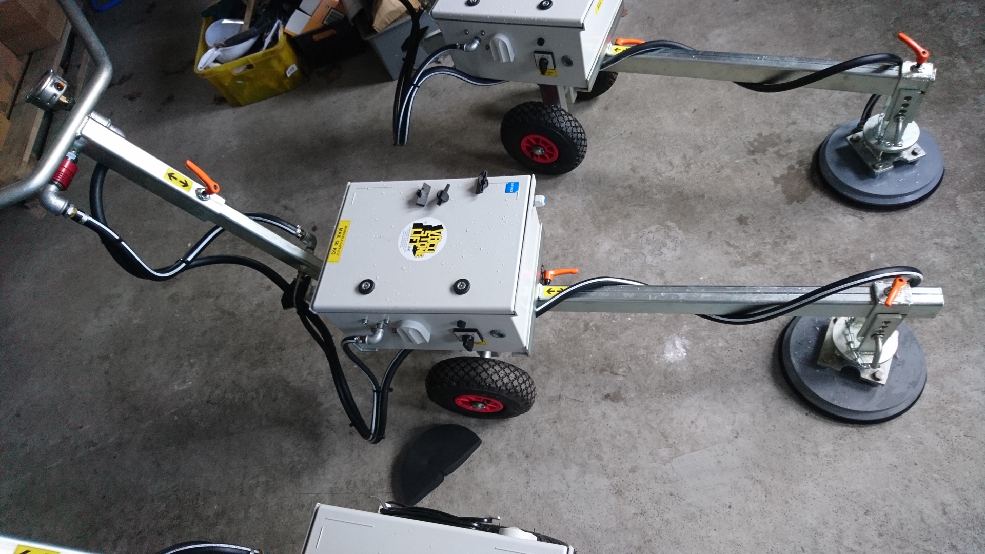 Vakuumlift til fliser og klinker - Liften har en indbygget vakuumpumpe som kører på batteri. Komplet system med indbygget batteri, batterilader og pumpe. Maskinen er forsynet med batteri indikator, samt med vakuum regulator som automatisk starter og stopper pumpe. Løfte kapacitet vandret ca.60kg ved 60% vakuum.